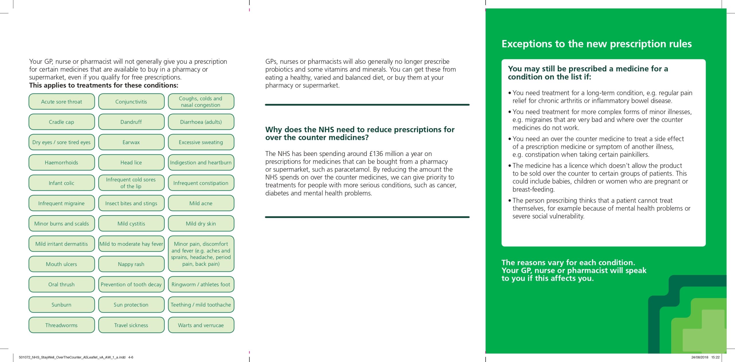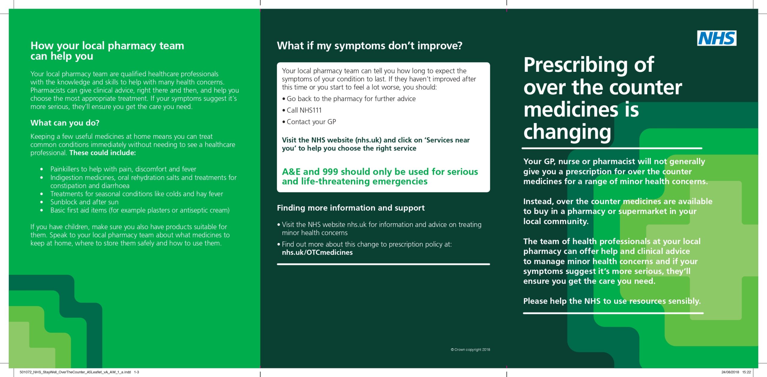 Practices in England have been provided guidance on reducing the prescribing of Over-the-Counter Medicines (OTC) for acute/self-limiting conditions. Pharmacists in the community are well placed and experienced to provide and support for these acute and limiting conditions. If the pharmacist thinks a patient needs treatment to help with symptoms, they can recommend an OTC item that can be purchased, or they can provide information about self-care service. Often OTC medicines are cheaper to purchase compared to getting them on the NHS.